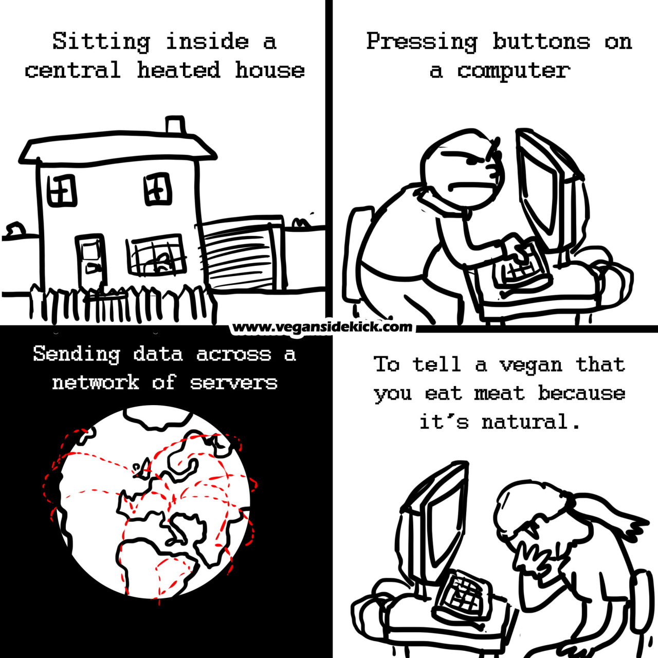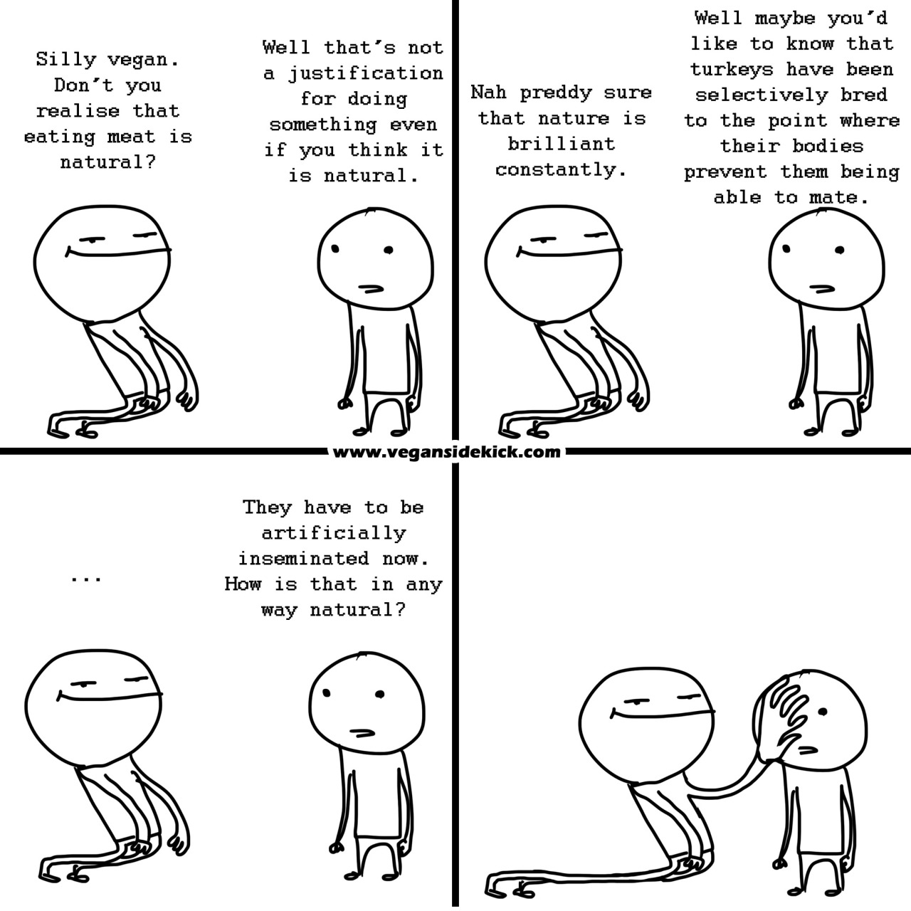 Even if we accept at face value the premise that man is a natural meat-eater, this reasoning depends on the claim that if a thing is natural then it is automatically valid, justified, inevitable, good, or ideal. Eating animals is none of these things. Further, it should be noted that many humans are lactose intolerant, and many doctors recommend a plant-based diet for optimal health. When you add to this that taking a sentient life is by definition an ethical issue - especially when there is no actual reason to do so - then the argument that eating meat is natural falls apart on both physiological and ethical grounds.